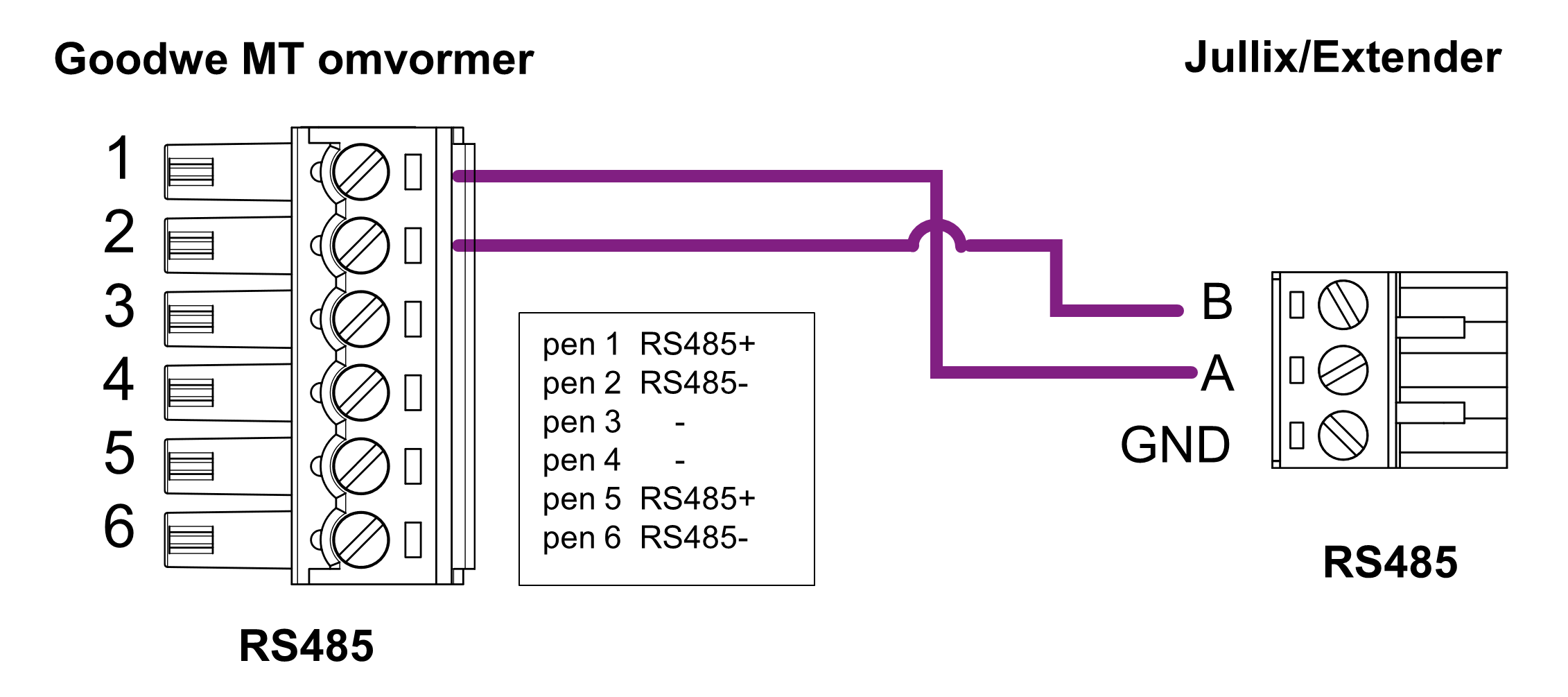 Op onderstaand schema zie je hoe de aansluitingen moeten gebeuren. Signaal goodwe 6 pen connector achter onderste frontpaneel: pen 1 → A en pen 2 → B .