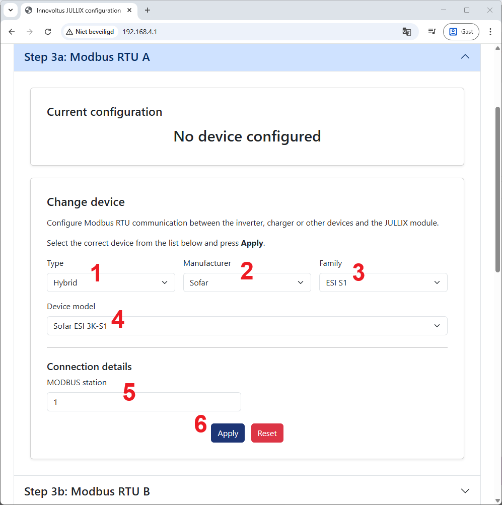 Wanneer je een SOFAR POWERALL hybride omvormer gebruikt, dan kies je in de modbus RTU configuratie bij Type: Hybrid (1) bij Manufacturer kies je Sofar (2). Bij Familiy kies je in dit geval ESI S1 (3) en bij Device Model, bijvoorbeeld Sofar ESI 3K-S (4) voor een eenfase hybride omvormer powerall van 3kW. Bij Connection details stel je bij MODBUS station (5) stel je het juiste modbus adres in; meestal is dit 1.