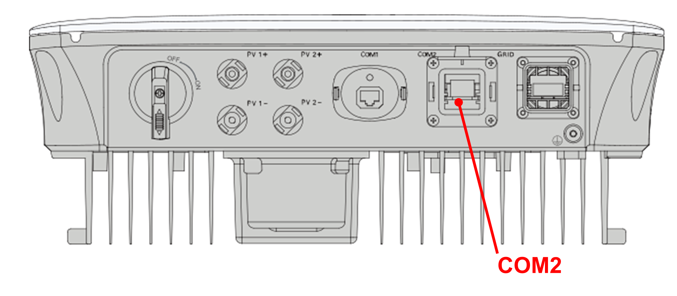 De Jullix of Extender wordt verbonden met de SGx.xRS via modbus/RS485 van de omvormer. Je vindt de RS485 aansluiting terug op de COM2 poort.