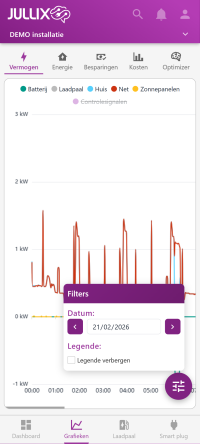 De via grafieken bereik je via de knop op het scherm kan je de verschillende grafieken van je energiebeheer bekijken.