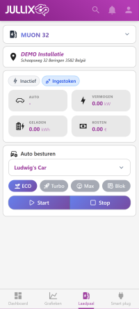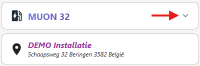 Boven in de app zie je welke laadpaal er geselecteerd, als je toegang hebt tot meerdere laadpalen kan je via de pulldown een andere laadpaal kiezen. Je ziet ook tot welke installatie de laadpaal behoort.