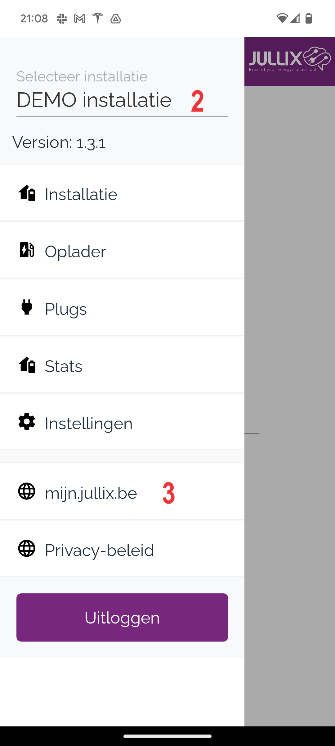 Via het menu(1) kan je de verschillende pagina's kiezen. Je er ook een andere installatie kiezen(2) als je toegang hebt tot andere installaties.