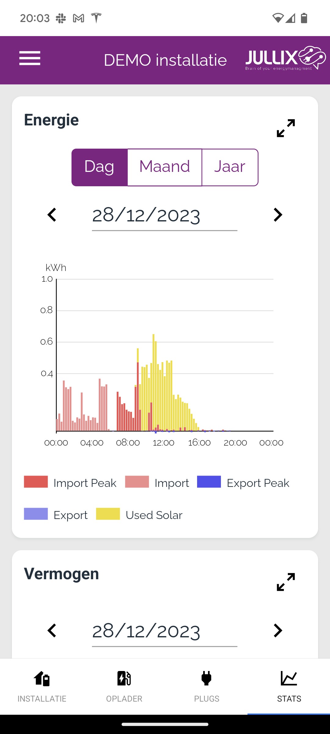 De eerste statistiek toont de energiegrafiek. In de energiegrafiek zie je de verschillende elementen van een installatie: de geïmporteerde energie tijdens dal en piek in het rood. De geëxporteerde energie in het blauw. De opgewekte energie van de PV-installatie in het geel. De grafiek kan je per dag, per maand of per jaar bekijken. Via de kalender kan je andere data kiezen en bekijken.