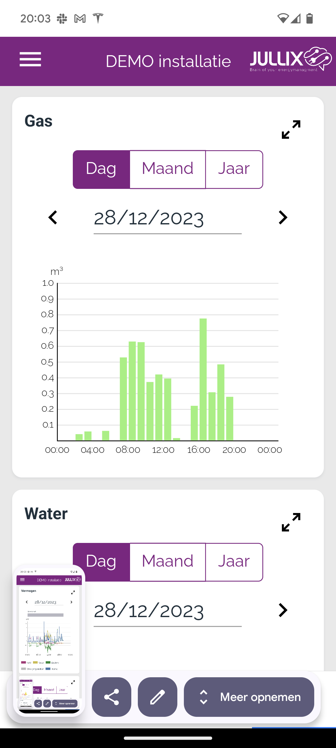 Als je gasmeter geconnecteerd is met je digitale energiemeter, kan je het gasverbruik in deze grafiek weergeven. De grafiek toont het verbruikte gasvolume in kubieke meter.