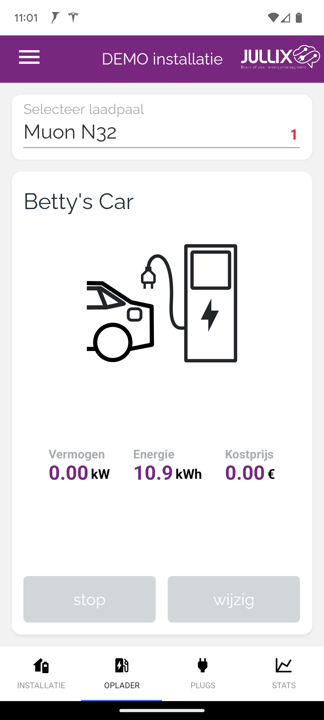 Bovenaan zie je de naam van de laadpaal die geselecteerd is. Op de pagina zie je de status van de geselecteerde laadpaal. Als er geen auto is aangesloten, zie je de naam van het voertuig dat het laatst is aangesloten geweest en het vermogen dat er toen geladen is. Als je toegang hebt tot meerdere laadpalen, kan je door op de naam van de laadpaal(1) te tikken een andere laadpaal kiezen.