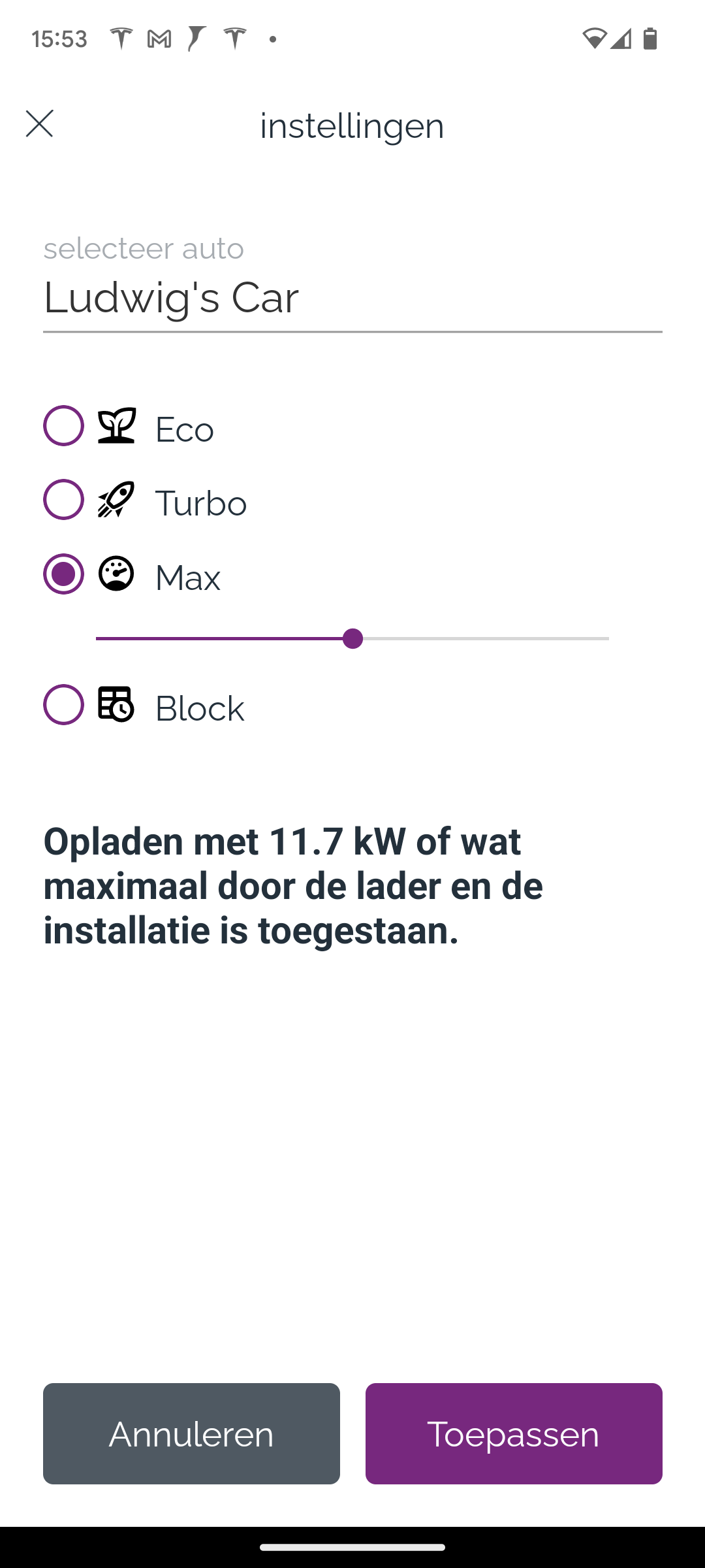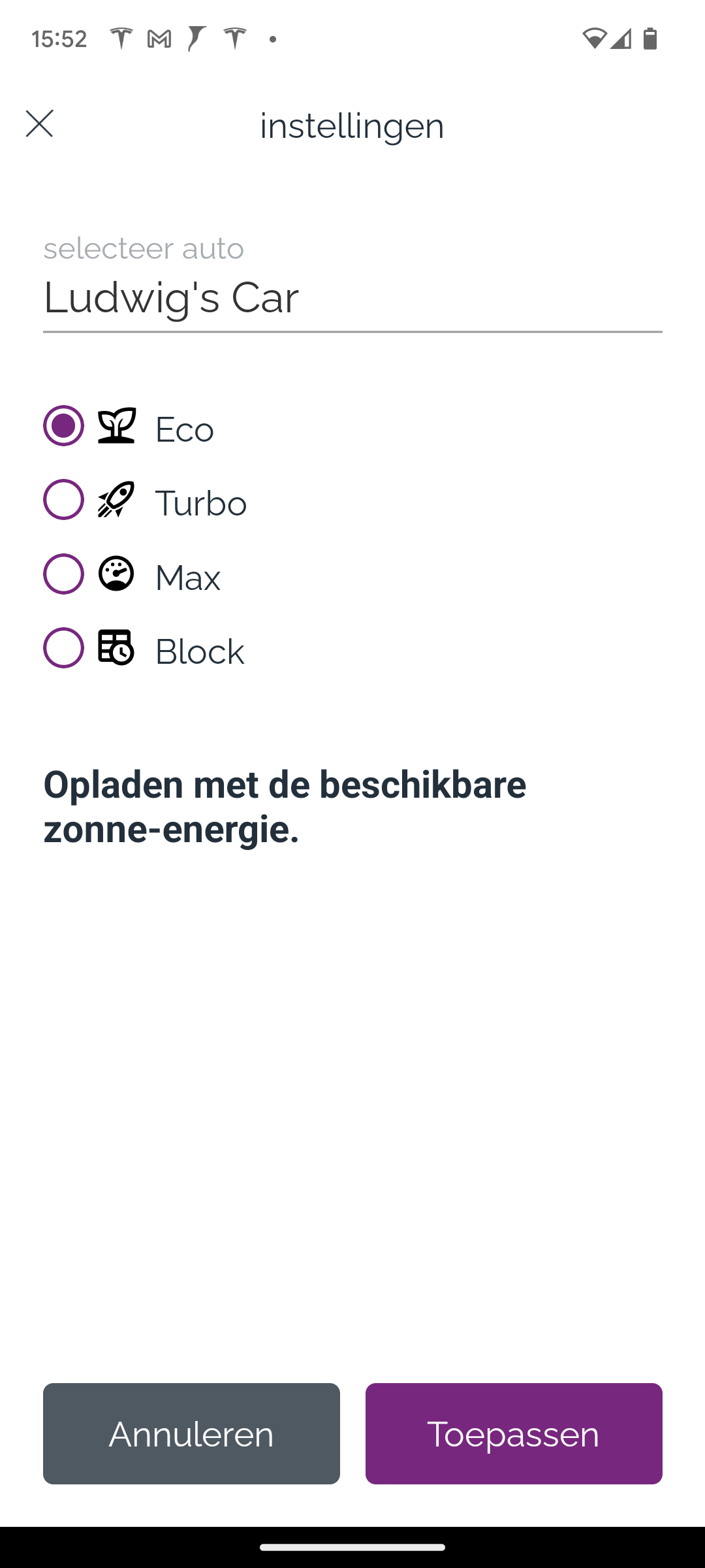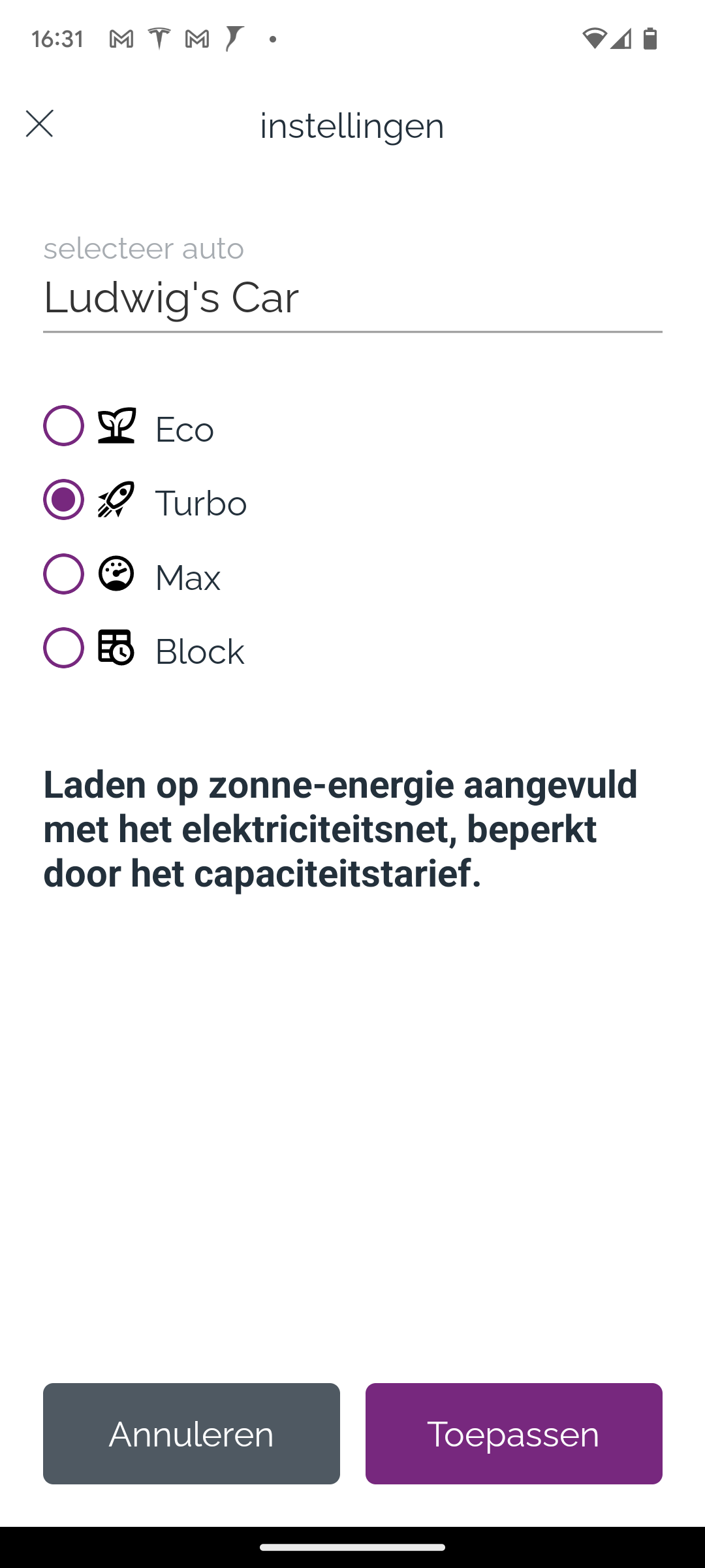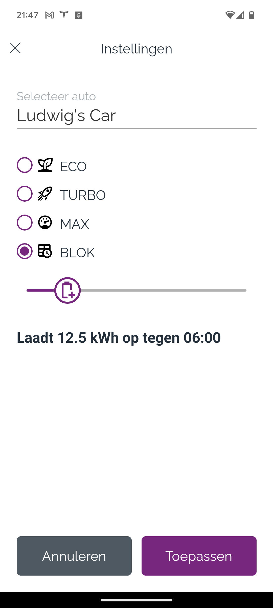 Je kan uit verschillende laadmodi kiezen. De app onthoudt de laatst gekozen laadmodus.
