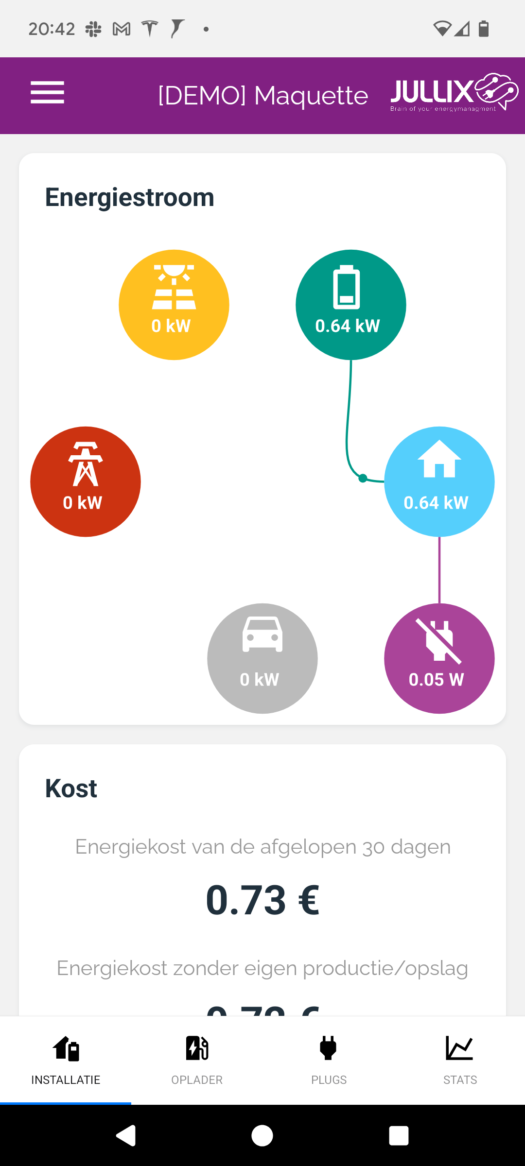 Onder de animatie(3) vind je het vermogen waarmee de laadpaal aan het laden is, hoeveel energie er in de huidige laadbeurt al geladen is en wat de kostprijs van de laadbeurt momenteel is.