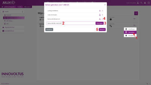 Om een gebruiker toe te voegen, geef je zijn e-mailadres in (2) en je klikt op Toevoegen (3).
