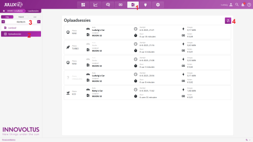 Je krijgt een pagina met daarin de verschillende oplaadsessies. Je kan de datum kiezen 3 en de laadsessies per dag of maand 3 weergeven.