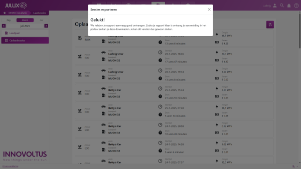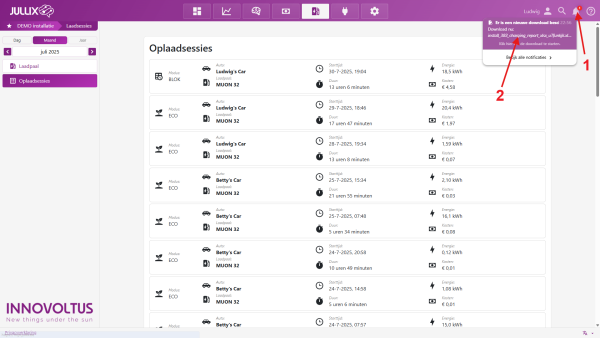 Via Laadpaal > Oplaadsessies > Sessies exporteren kan je de oplaadsessies exporteren naar een xls bestand. Je krijgt een dialoog te zien waar je kan de laadpaal of installatie 1 en de periode 2 kan selecteren en vervolgens het Rapport aanvragen 3.