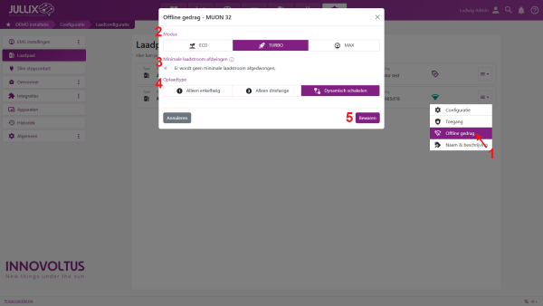 Via Offline gedrag (1) kan je instellen hoe de auto geladen wordt als het internet wegvalt. De auto zal dan automatisch geladen worden volgens de instellingen die hier gemaakt zijn.