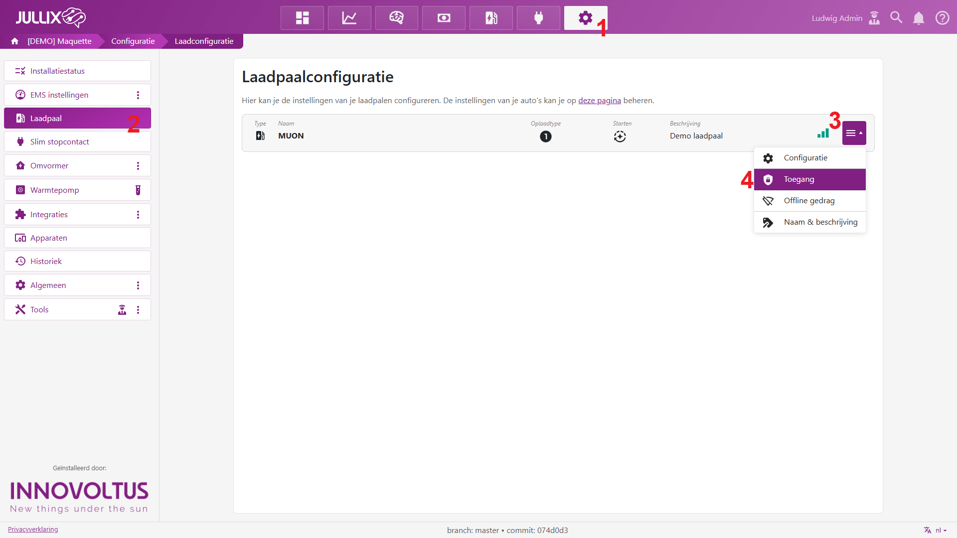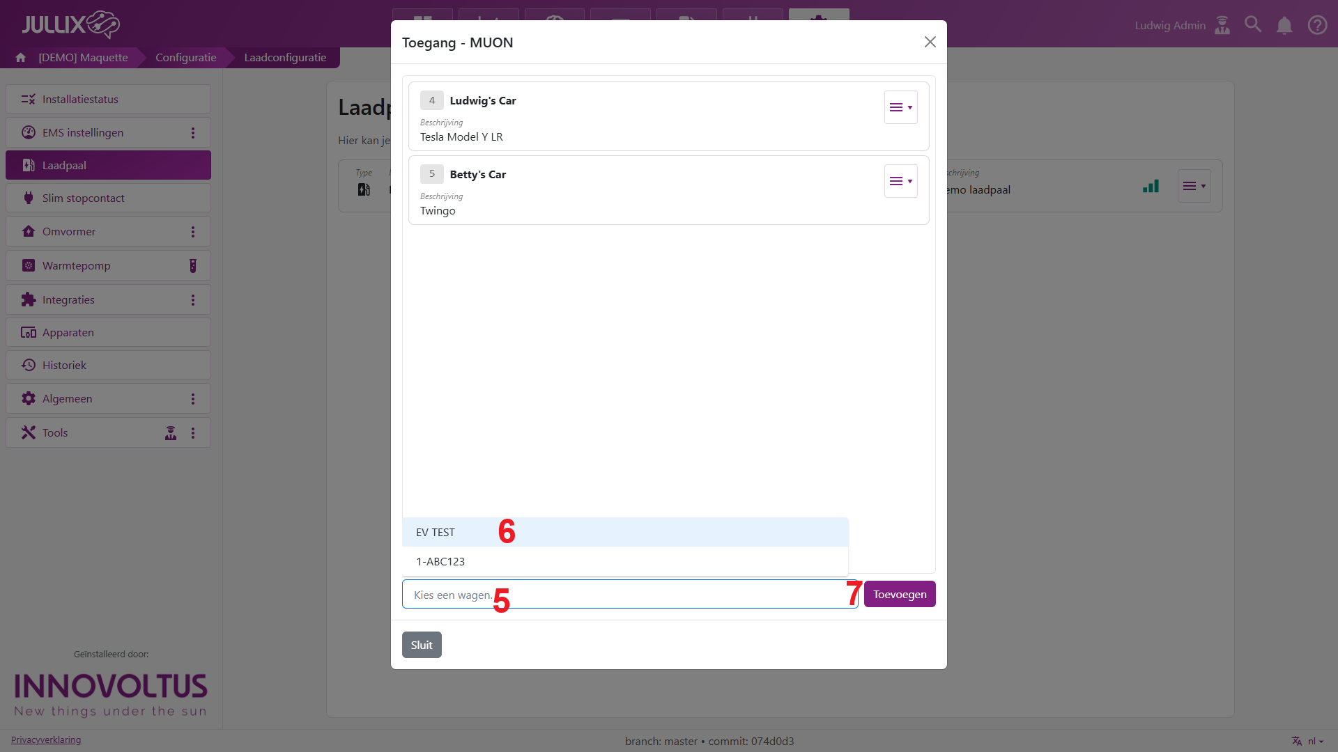 In het menu (3) bij de laadpaal via Toegang (4) kan je instellen welke Auto's geladen mogen worden aan de laadpaal. Je krijgt een lijst met auto's die toegang hebben tot de laadpaal.