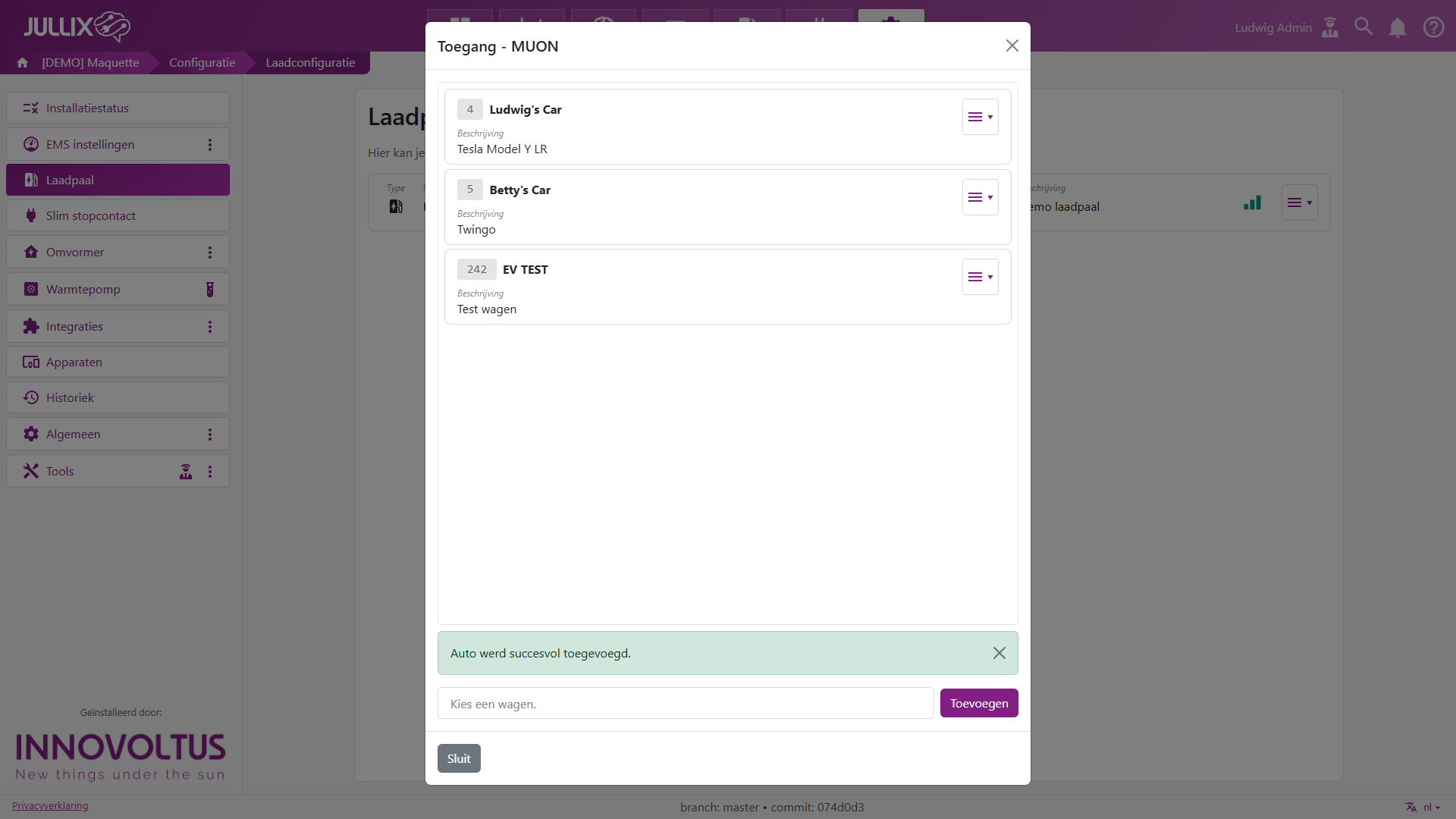 De lijst met auto's die toegang hebben tot de laadpaal wordt geüpdatet.