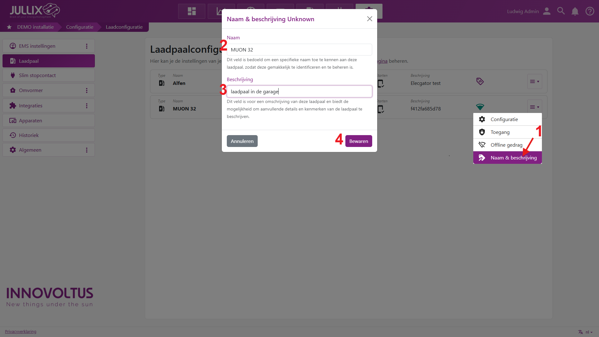 Via Naam & beschrijving (1) kan je de naam van de laadpaal en de beschrijving aanpassen.