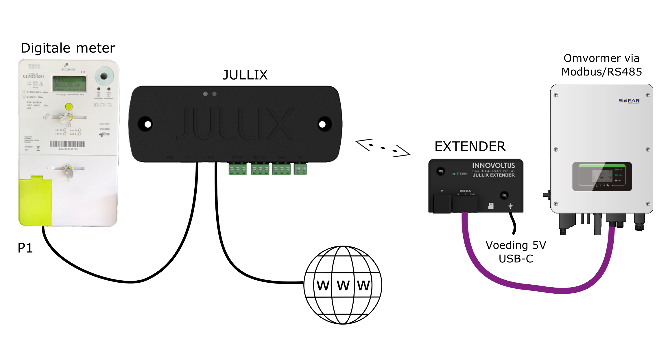 Als bijvoorbeeld een omvormer niet aan Jullix kan aangesloten worden, kan de omvormer via een extender aangesloten worden. De extender moet dan nog wel voeding krijgen via USB-C.