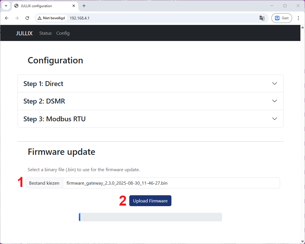 Onderaan de config-pagina vind je de Firmware update dialoog. Je klikt op de knop Bestand kiezen (1) om het bestand op je smartphone of laptop te kiezen. Vervolgens klik je op Upload Firmware (2) om de firmware te updaten.