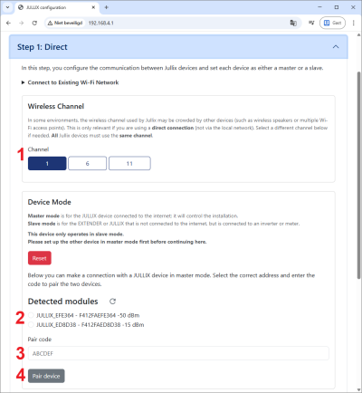 Via Step 1: Wireless verbind je Extender draadloos met de Jullix Master. Het apparaat - omvormer, laadpaal, digitalemeter, … - wordt op die manier draadloos verbonden met de Jullix gateway. Voordat je de extender kan verbinden moet je dus zorgen dat je de paircode van de Jullix waarmee je wil verbinden bij de hand hebt. Als je de paircode hebt kan je de verbinding maken.