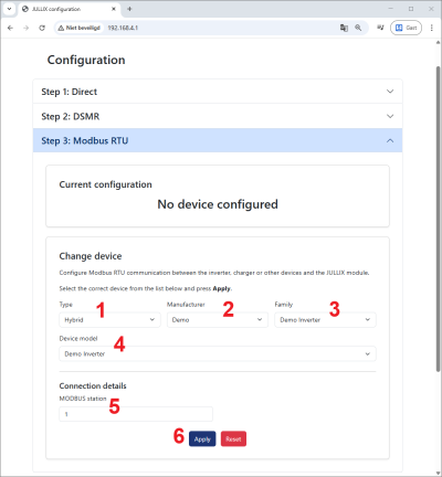 Bij Step 3: Modbus RTU stel je in welk apparaat je hebt aangesloten op RS485A van de Extender.