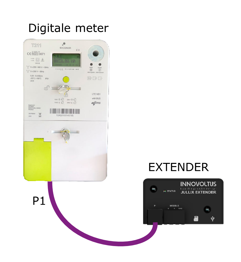 Als de digitale meter niet aan Jullix kan aangesloten worden, kan hij via een extender verbonden worden. Het is belangrijk enkel de kabel die bij Jullix geleverd is te gebruiken.