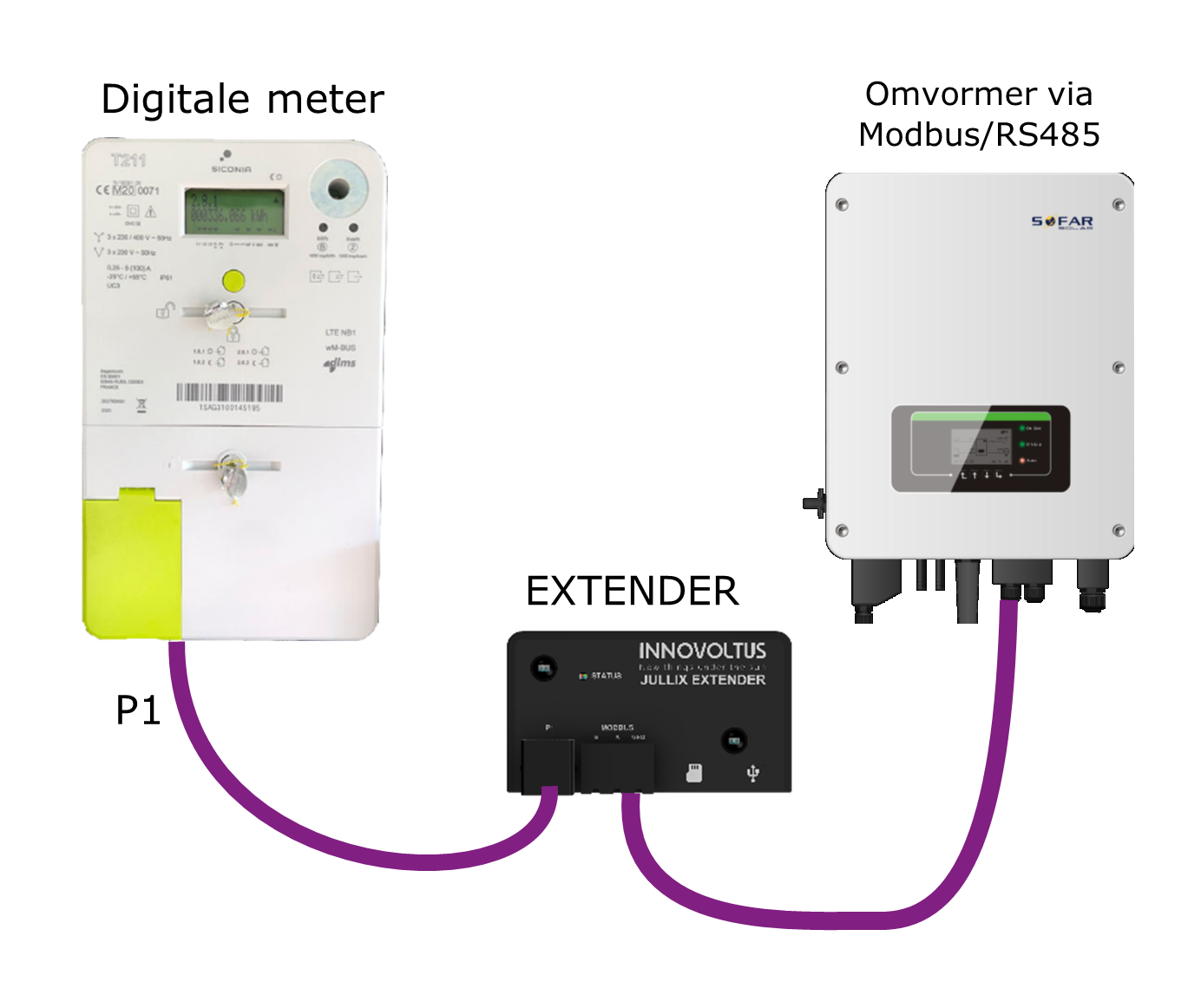 Via één extender kan je eveneens de digitale meter en de omvormer aansluiten.