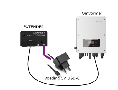Als enkel de omvormer via de Extender wordt verbonden, moet je de extender ook nog voeden. Soms kan dat via een extra verbinding via de omvormer. Als dat niet kan dien je een voeding 5V USB-C te gebruiken.