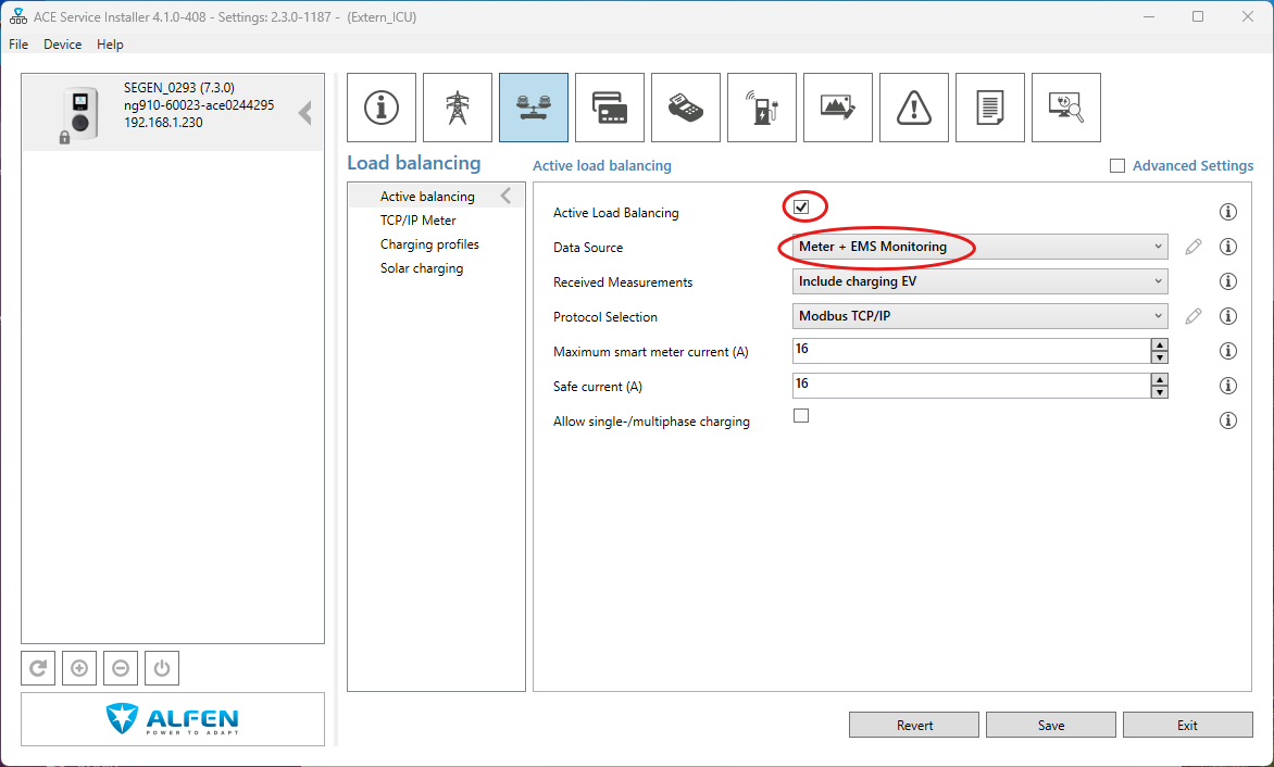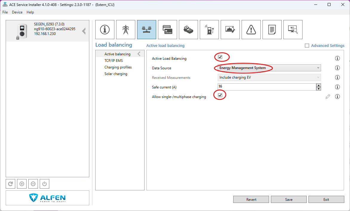 In de ACE Service Installer configuration tool schakel je de Active load balancing in. Bij Data Source kies je voor Energy Management System. Je vinkt ook Allow 1- and 3-phase charging aan.