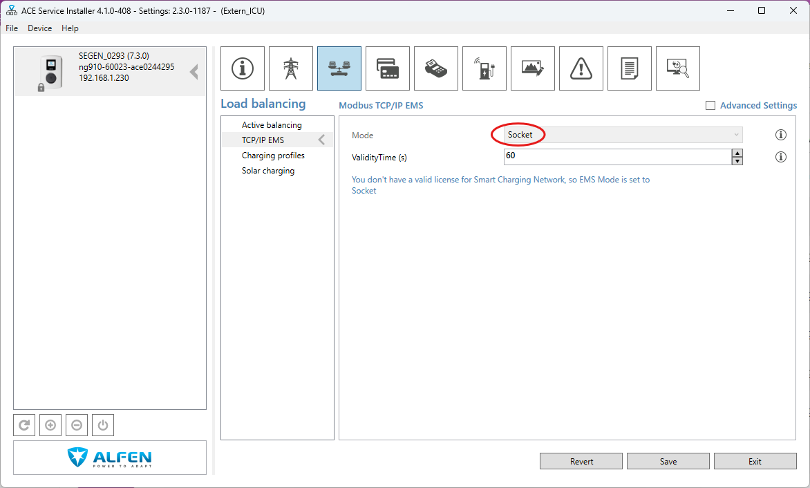 De Alfen laadpaal moet geconfigureerd worden om door de Jullix aangestuurd te worden. Hiervoor heeft de Alfen laadpaal ook nog een licentie nodig. Om de Alfen laadpaal te kunnen besturen via modbus-tcp heb je de 'Active Load Balancing'-licentie nodig.