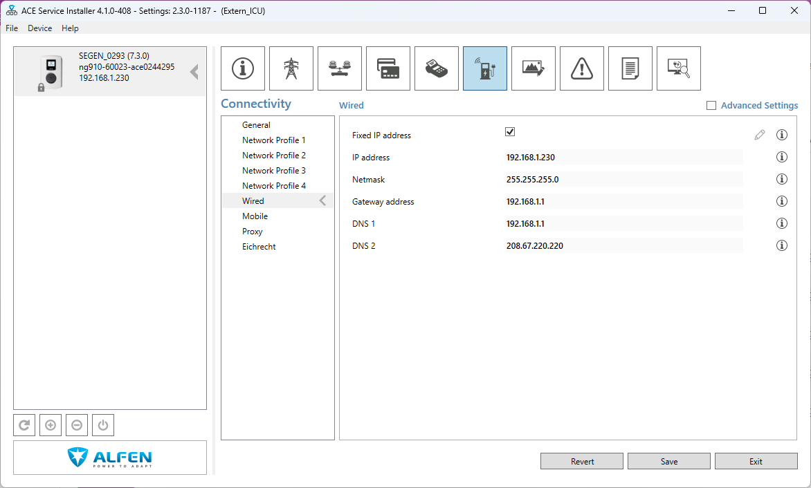 Voor een stabiele installatie zorg je er dus best voor dat het IP-adres van de laadpaal altijd hetzelfde is. De beste manier om dit te garanderen is door in de router waarmee de Alfen laadpaal verbonden is, een DHCP-reservering in te stellen zodat de Alfen laadpaal altijd hetzelfde IP-adres krijgt van de router. Dit is de aanbevolen manier. Als je weet welk vast-IP adres je mag gebruiken, dan is een andere mogelijkheid een vast IP-adres instellen in de Alfen laadpaal zelf via de ACE Service Installer configuration tool.