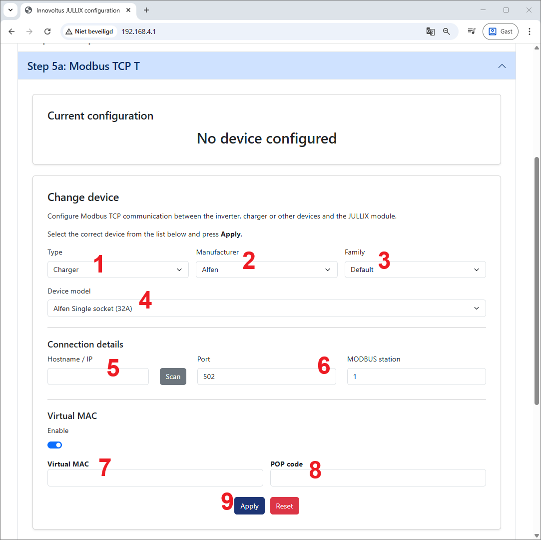 Vervolgens moet nog een virtueel MAC-adres ingesteld worden om de Alfen laadpaal te identificeren. Dit virtuele MAC-ID is absoluut noodzakelijk om de laadpaal via Jullix te kunnen besturen. Bij Virtual MAC zet je deze Enable in het veldVirtual MAC 7 vul je het Virtual MAC in met bijhorende POP code 8.