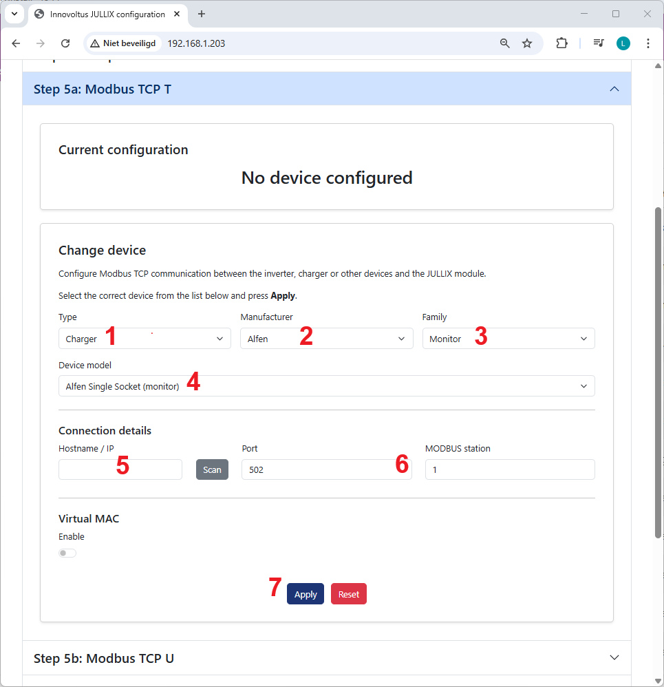 Heb je een Alfen met twee laadpoorten dan herhaal je de configuratie. Je kiest dan de volgende vrije Modbus TCP. Bij Device model 4 kies je nu de andere poort Alfen Dual Socket (right of lef en 16 of 32A) . Je stelt hetzelfde IP-adres in bij Hostname/IP 5 en je kiest dezelfde Port en modbus-adres bij MODBUS station. Je moet opnieuw een Virtual MAC instellen 7, je gebruikt hiervoor een ander een tweede virtual MAC-ID.