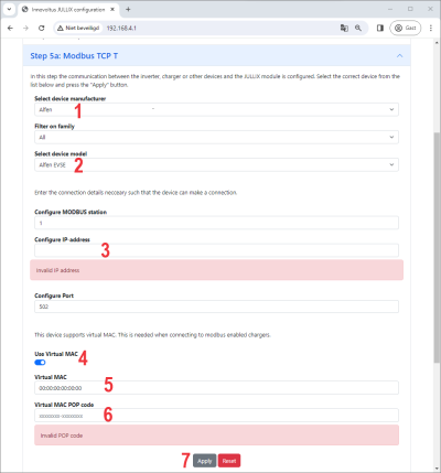 Vervolgens moet nog een virtueel MAC-adres ingesteld worden om de Alfen laadpaal te identificeren. Dit virtuele MAC-ID is absoluut noodzakelijk om de laadpaal via Jullix te kunnen besturen. Je schakelt Use Virtual MAC4 in en je vult het Virtual MAC5 met bijhorende Virtual MAC POP code6 in.