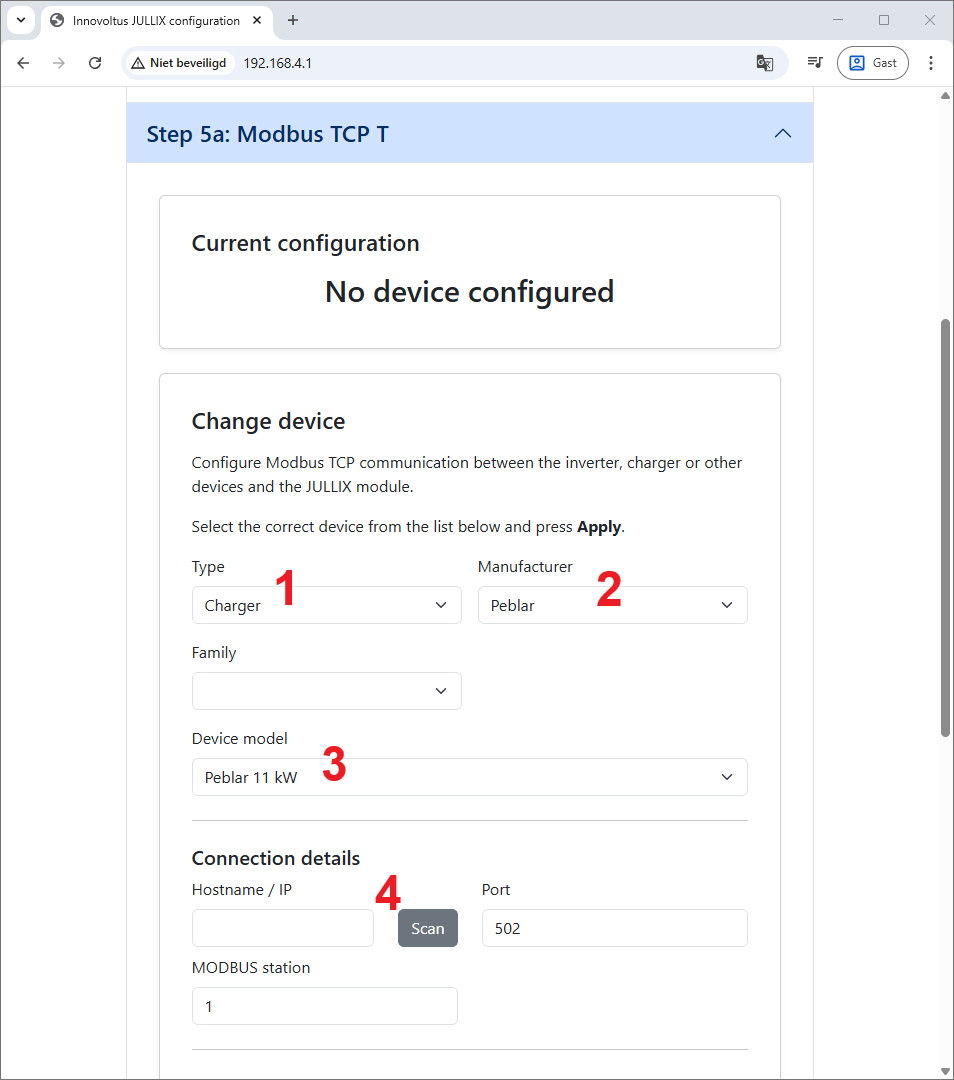 Wil je de laadpaal met de Jullix verbinden via het 'IP-adres', dan moet het IP-adres dat aan de Peblar laadpaal is toegewezen, ingesteld worden bij de Jullix. Als dit verandert moet dit ook in Jullix aangepast worden.