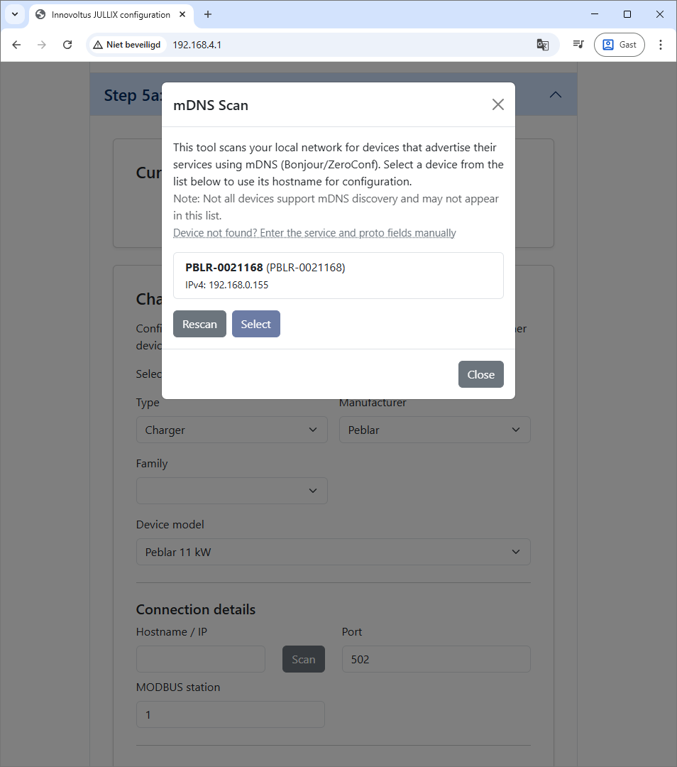 De Peblar laadpaal dient verbonden te worden via het netwerk. De communicatie met Jullix gebeurt via het netwerk. Het is belangrijk dat Jullix en de Peblar laadpaal via hetzelfde netwerk verbonden zijn.