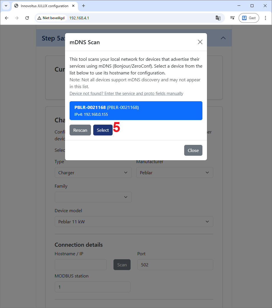 Je kiest de gevonden laadpaal en klikt op Select 5 om de laadpaal te selecteren.