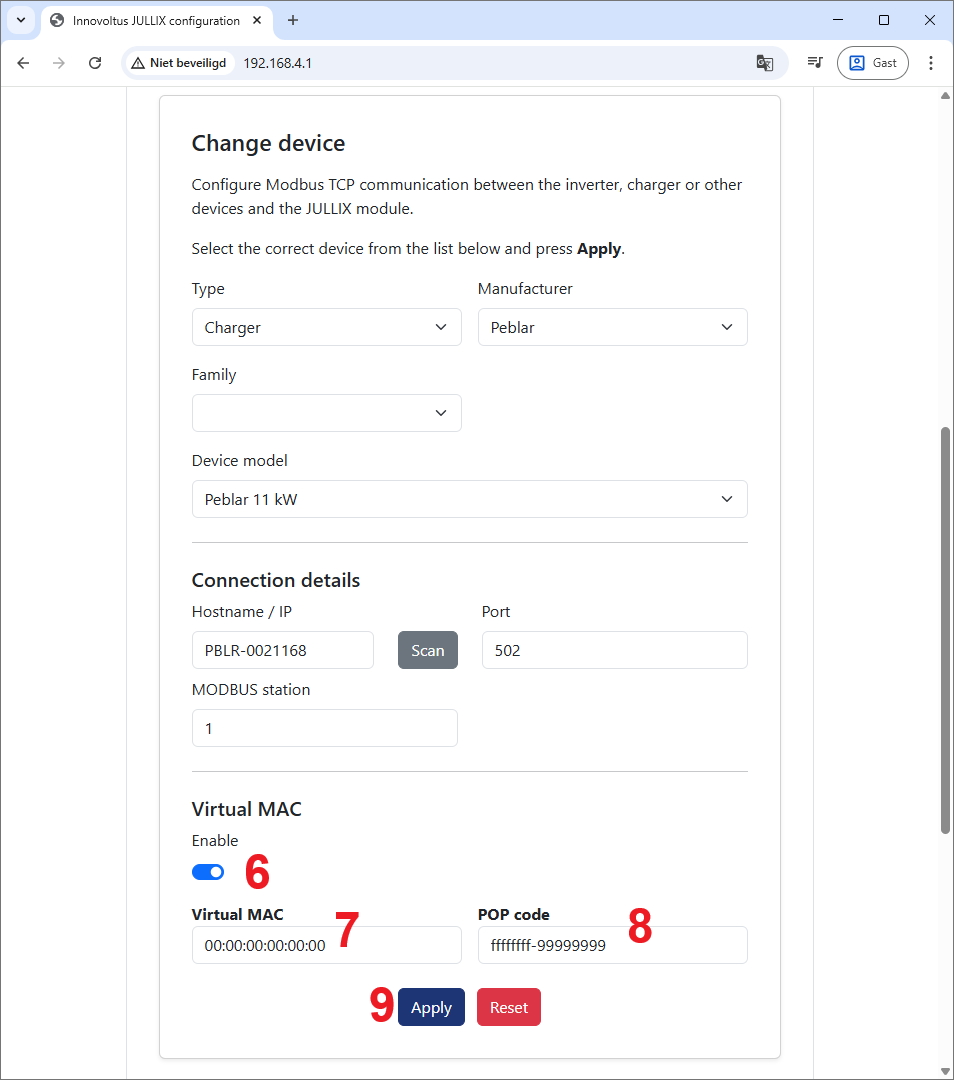 Vervolgens moet nog een virtueel MAC-adres ingesteld worden om de Peblar laadpaal te identificeren. Dit virtuele MAC-ID is absoluut noodzakelijk om de laadpaal via Jullix te kunnen besturen.