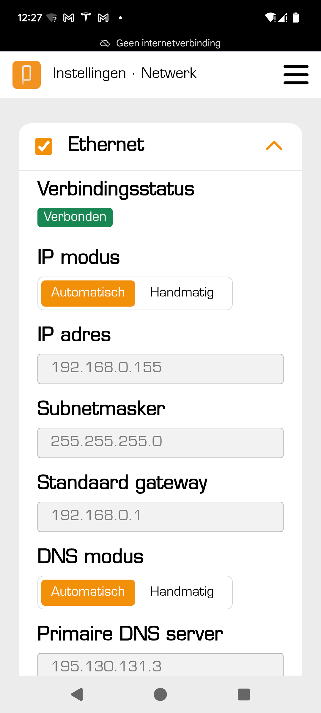 Standaard krijgt de Peblar laadpaal automatische een IP-adres toegewezen van de router waarmee hij verbonden is.