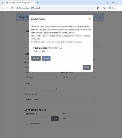 Wil je de laadpaal met de Jullix verbinden via het 'IP-adres', dan moet het IP-adres dat aan de Peblar laadpaal is toegewezen, ingesteld worden bij de Jullix. Als dit verandert moet dit ook in Jullix aangepast worden.