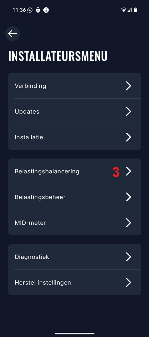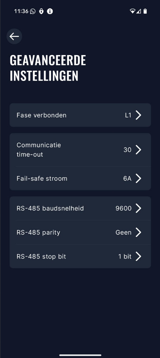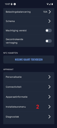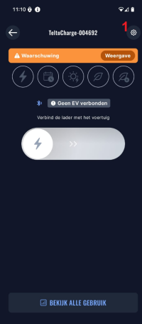 Nadat je verbinding hebt gemaakt met de laadpaal klik je op 1 Instellingen.