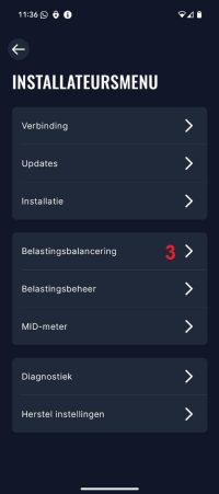 Wanneer u de beveiligingsinstellingen heeft ingegeven, gaat u door naar het Installateursmenu 2, en verder naar Belastingsbalancering 3.