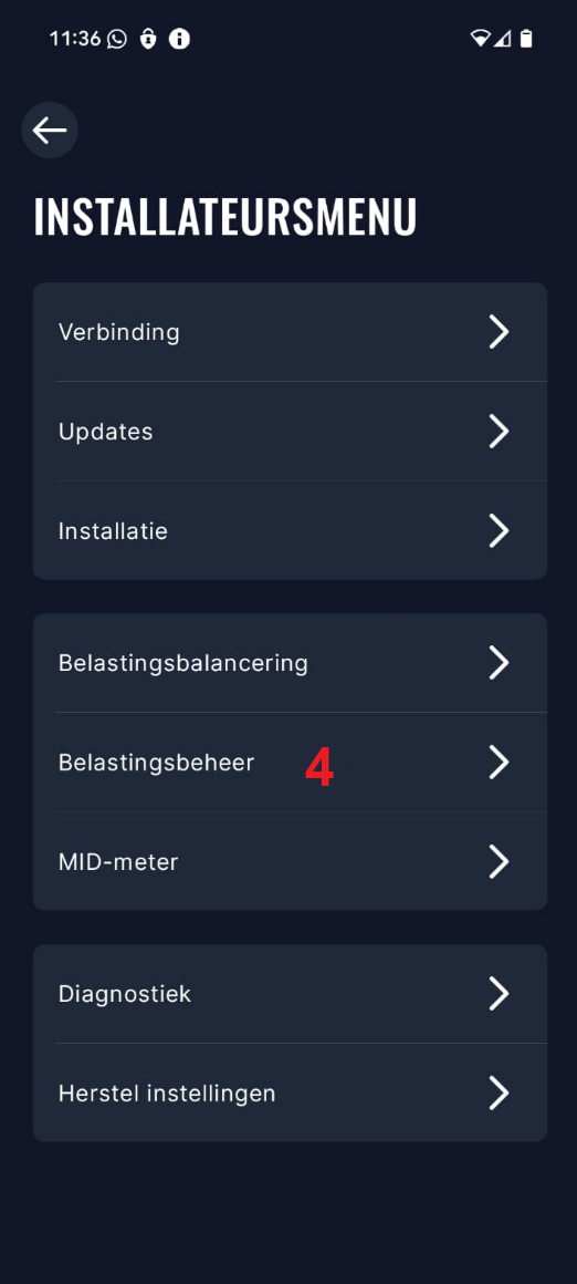 U gaat vervolgens terug naar het Installateursmenu en u kiest nu voor Belastingsbeheer 4.