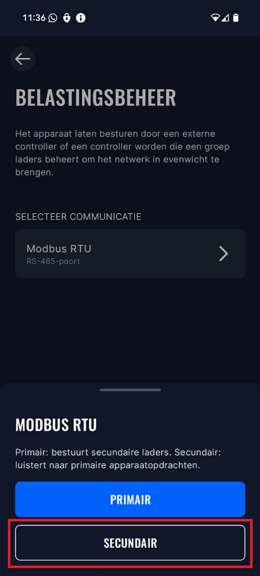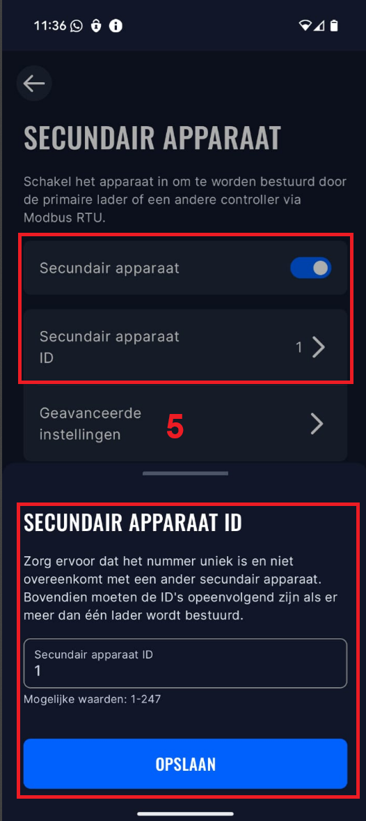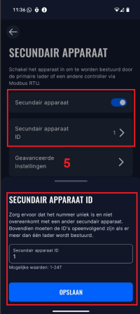 U klikt op Modbus RTU en kiest u voor SECUNDAIR, en vinkt u Secundair apparaat aan, u stelt bij Secundair apparaat ID “1” in.