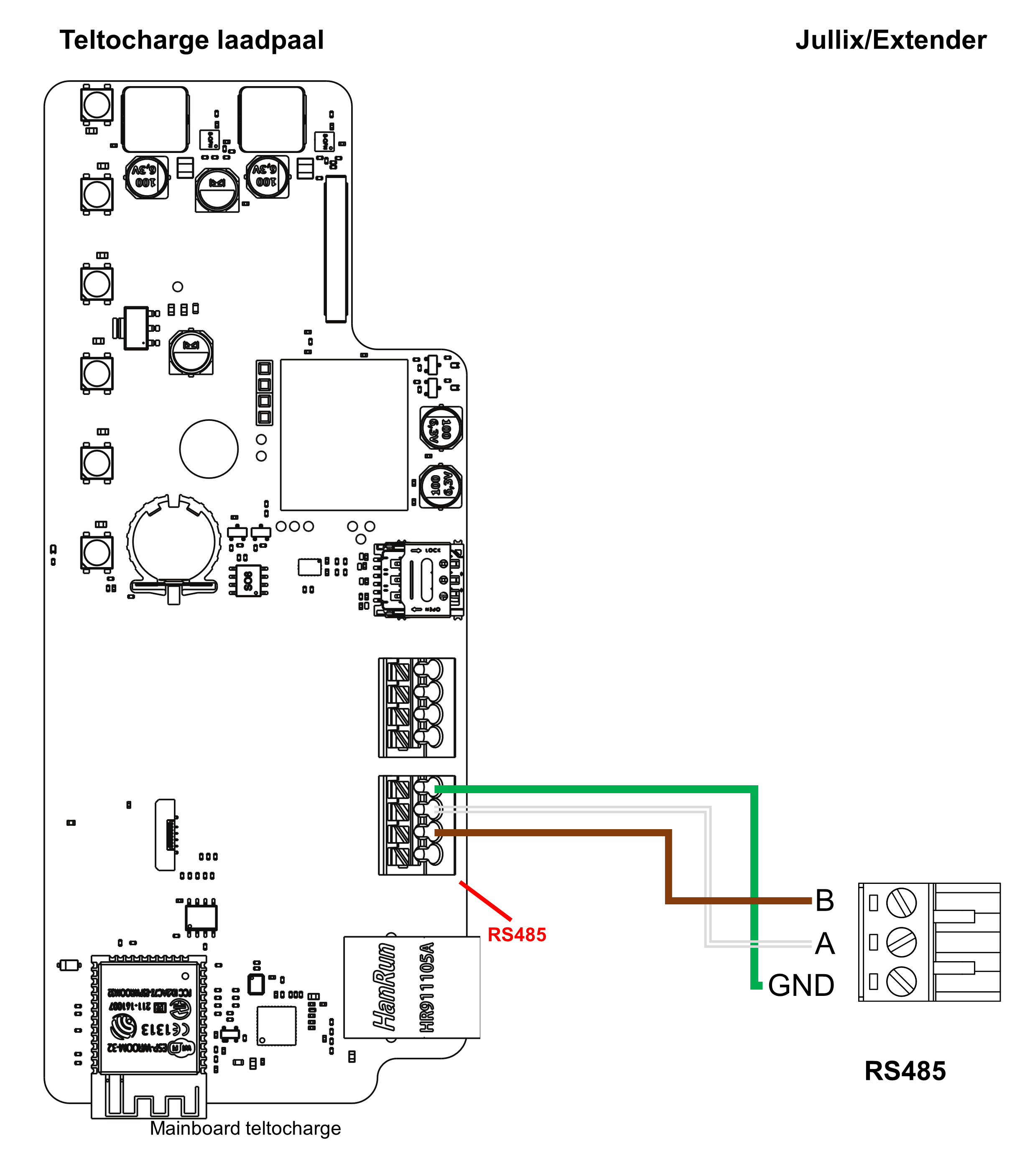 De TeltoCharge laadpaal wordt via een RS485-verbinding aangesloten aan de Jullix of extender. De dataleiding modbus-RTU wordt aangesloten aan de TeltoCharge RS485-aansluiting op het mainboard van de laadpaal.