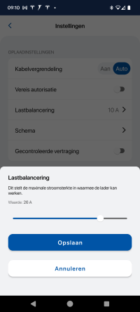 In het instellingen-menu stel je de beveiling(zekering) van je laadpaal in. Als je dynamisch wil schakelen van 1 naar 3 fase moet je zekering minimaal 16A zijn en stel je die hier ook zo in.