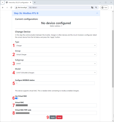 Wanneer je de CHINT energiemeter gebruikt om laadpaal-energie te meten, dan kies je in de modbus RTU configuratie bij Type: Charger (1) in de Group kies je Virtual Charger (2). In de Subgroup duidt je dan de juiste merk aan, in dit geval CHINT (3) en vervolgens het juiste model CHINT DTSU666 (4). In Configure modbus station stel je het juiste modbus adres in; meestal is dit 1 (5). Via Apply (6) worden de instellingen bewaard.