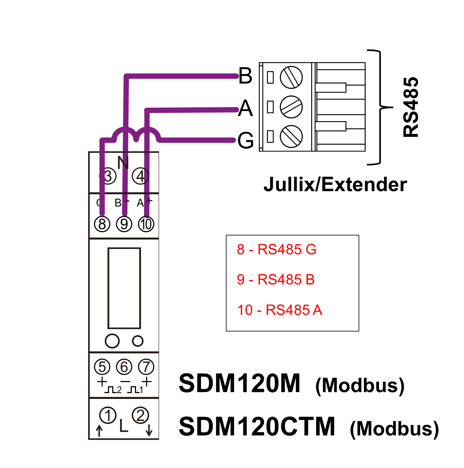 De Jullix of Extender wordt verbonden met de EASTRON energiemeter via de RS485 aansluitingen.