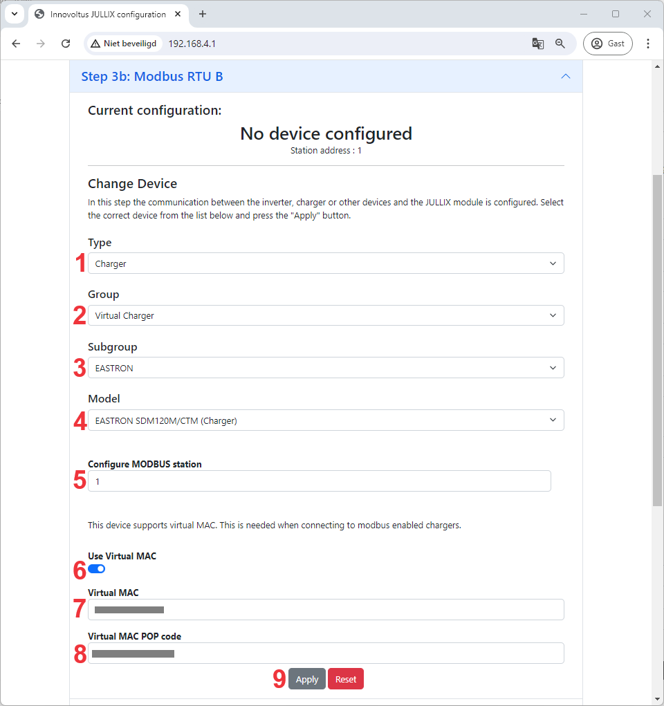 Wanneer je de EASTRON energiemeter gebruikt om energie te meten naar een niet ondersteunde laadpaal, dan kies je in de modbus RTU configuratie bij Type: Charger (1) in de Group kies je Virtual Charger (2). In de Subgroup duidt je dan de juiste merk aan, in dit geval EASTRON (3) en vervolgens het juiste model EASTRON SDM120M/CTM (4). In Configure modbus station stel je het juiste modbus adres in; meestal is dit 1 (5).