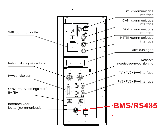 De Jullix of Extender wordt verbonden met de Goneo hybride omvormer via modbus/RS485 van de omvormer. Je vindt de RS485 aansluiting terug op de BMS poort van de omvormer. Je hebt een splitter nodig om zowel de batterij als de Jullix met de BMS poort te verbinden. Deze splitter kan je bij GONEO bekomen.