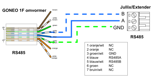 Op onderstaand schema zie je hoe de aansluitingen moeten gebeuren. Signaal RS485A 4 blauw → A, RS485B 5 blauw/wit → B en GND 3 groen/wit → G.