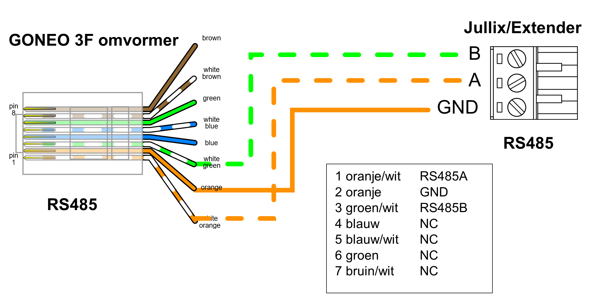 Op onderstaand schema zie je hoe de aansluitingen moeten gebeuren. Signaal RS485A 1 oranje/wit → A, RS485B 3 groen/wit → B en GND 2 oranje → G.