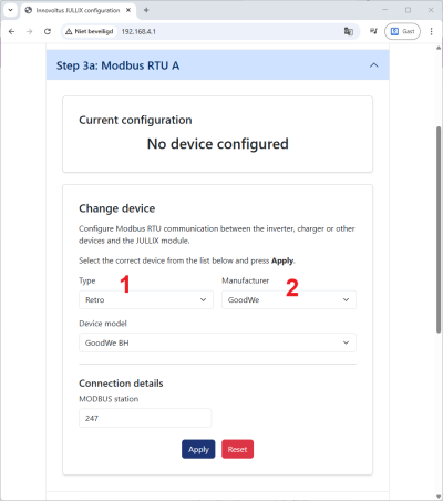 In de Jullix of Extender moet de omvormer communicatie nog geconfigureerd worden. Wanneer je een Goodwe retro omvormer gebruikt, dan kies je in de modbus RTU configuratie bij Type: Retro (1) in de Manufacturer kies je Goodwe (2). Bij Device Model (3) kies je het juiste model, bijvoorbeeld GoodWe BH.